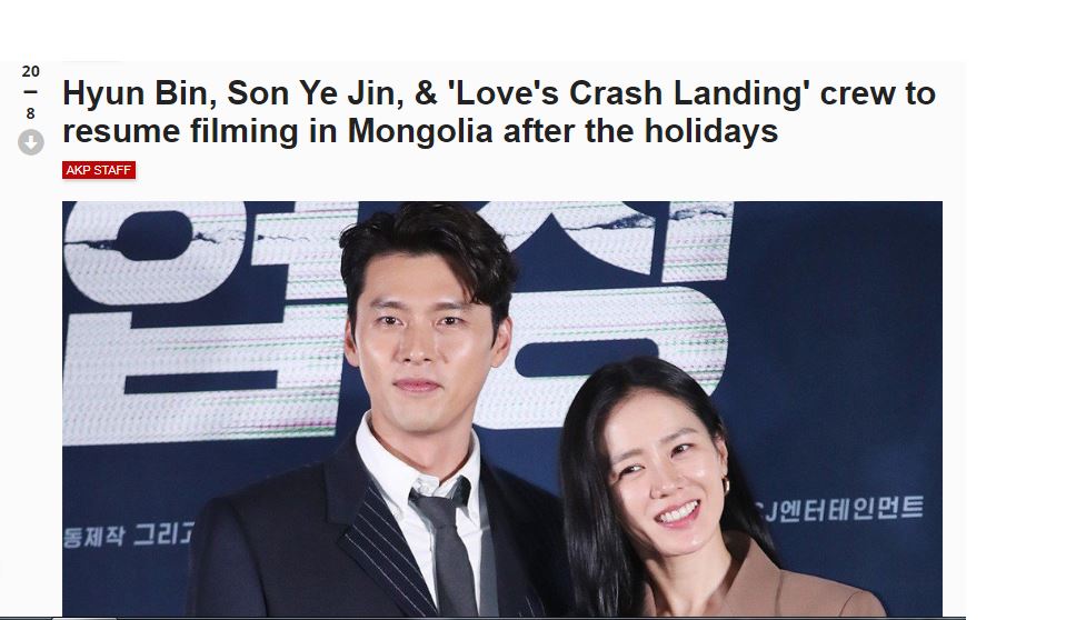 Өмнөд Солонгосын алдарт жүжигчид болох Хён Бин, Сун Е Жин нарын гол дүрд нь тоглож буй "Crash Landing of Love" кино 2020 онд нээлтээ хийнэ. Кино багийнхан зураг авалтынхаа нэгээхэн хэсгийг Монголд үргэлжлүүлэхээр өнөөдөр /2019.09.16/ Улаанбаатарыг зорин ирэх гэнэ.