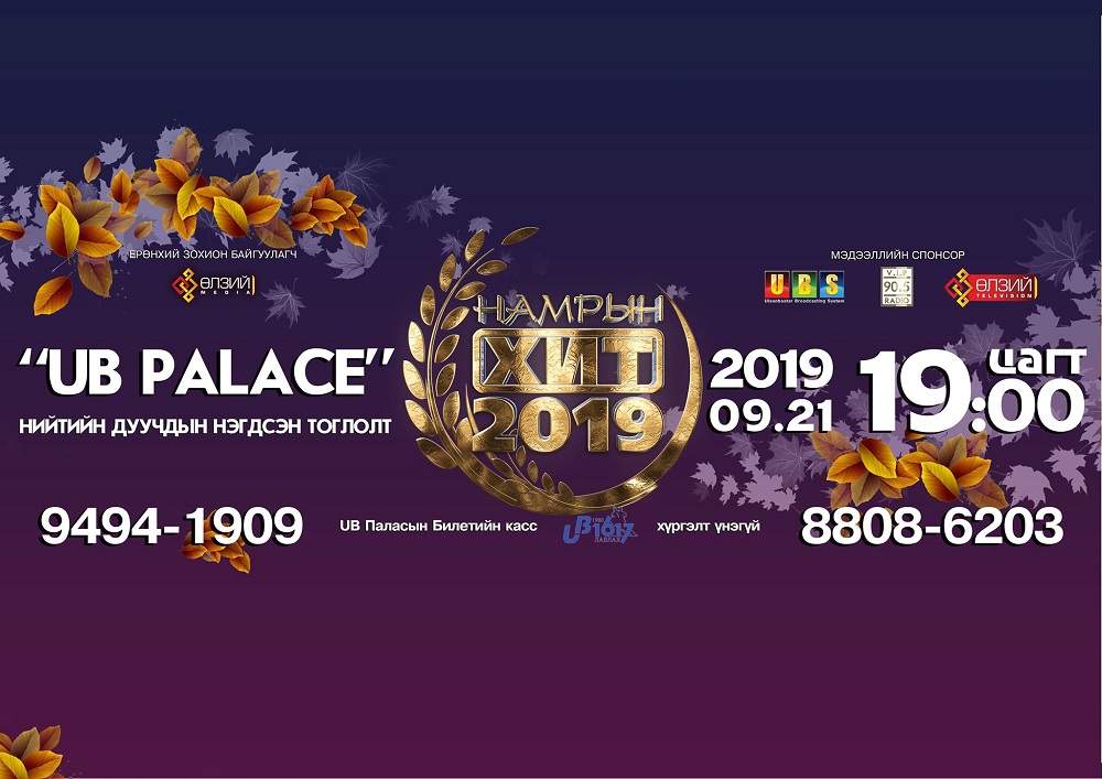 Энэ намар цагийн хамгийн анхны сюрприз дүүрэн "Намрын Хит - 2019" тоглолт 2019 оны 9 дүгээр сарын 21-ний өдрийн 19.00 цагт UB паласын концертын их танхимд болно.