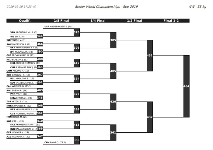 53 кг-ын жинд ОУХМ Э.Сумъяа Камеруны Жозеф Ессомбетэй эхний тойрогт таарсан. Ессомбе 2016 оны олимпод оролцож байсан 31 настай туршлагатай бөх. Африкийн АШТ-ий хоёр мөнгө, гурван хүрэл медальтай.