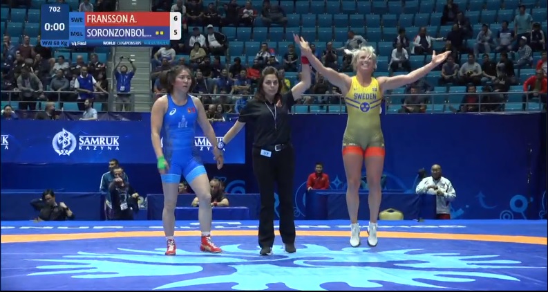 Ингээд Шведийн олимпын хүрэл медальт, дэлхийн аварга Йенни Франссонтой барилдлаа. Эхэлж оноо авсан манай тамирчин барилдаан дуусах гэж байхад 5-1 оноо тэргүүлж байгаад цаг дуусах үед илт оноогоо хамгаалан зугтсан. Дэвжээнээс гарсаар нэг, хоёр, гурван оноо өглөө. Оноо 5-4 болжээ. Ингээд ялах нь гэж байтал сүүлийн секундэд Йенни манай тамирчны ард гарч, 2 оноо авч, нийлбэр оноо 5-6 Шведийн тамирчин яллаа. Түүнийг оноо авахтай зэрэгцэн, цаг дууссан юм.