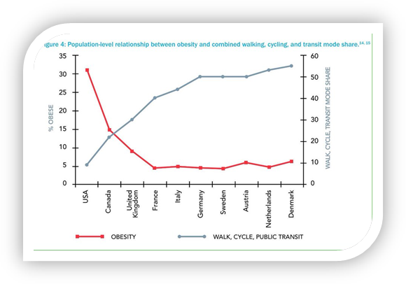 Графикаас харахад Америкчуудын зөвхөн 6% нь л явганаар, унадаг дугуйгаар, нийтийн тээврээр зорчдог ба үлдсэн хэсэг нь хувийн машинаар зорчдог байна. Гэтэл Америкчуудын таргалалтын хувь бусад бүх улсынхаас илүү буюу 32%-нь жингийн илүүдэлтэй байна. Эсрэгээрээ Дани улсын 50%-с дээш иргэд нь машины бус тээврийг ашигладаг ба таргалалт мөн хамгийн бага хувьтай байна. Машины хэрэглээ нь өөрөө худалдаж авахаас эхлээд бензин түлш, засвар гэх мэт маш их зардалтай байдаг. 2018 онд л гэхэд Улаанбаатарчууд бид 64,000 авто машин импортоор авахад 407,000,000 америк доллар зарцуулжээ. Энэ их мөнгийг боловсрол болон орон сууц авахад зарцуулсан бол нийт эдийн засагт маш их хэрэгтэй байх санж.