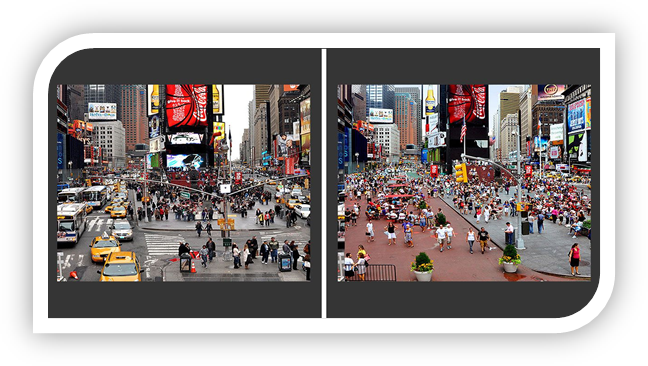 Дэлхийд алдартай нэгэн жишээ дурдахад New York хотын удирдлага хамгийн их хүн цугладаг хамгийн ачаалалтай байдаг Time Square-н авто замын нэг талын хэсгийг нь хааж зөвхөн явганаар зорчдог болгосон байна. Энгийн ухаанаар бодоход машины замыг хааснаар маш их түгжрэл үүсэж сөрөг нөлөө бий болох мэт. Гэтэл тэр хэсгийг машингүй гудамж болгосноор авто осол 63%-р буурч, эдийн засгийн эргэлт 11%-р өссөн байна. Явган зорчигчид өснө гэдэг нь эргээд тухайн орчны жижиглэн худалдааны бизнес өргөжин тэлэх сайн талуудтай байдаг.