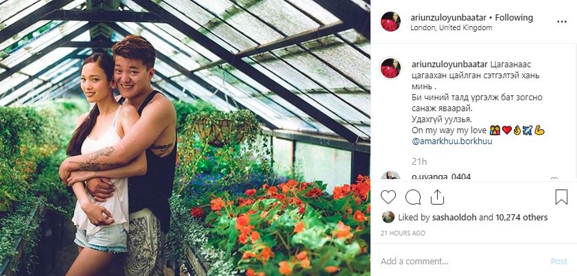 Тэрбээр "Цагаанаас цагаахан цайлган сэтгэлтэй хань минь. Би чиний талд үргэлж бат зогсоно, санаж яваарай. Удахгүй уулзъя. On my way my love" хэмээн бичиж, Английн Лондон хотод байгаа байршил заажээ.