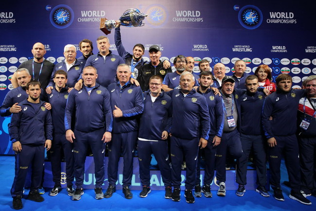 ОХУ-ын эрэгтэйчүүдийн шигшээ баг 10 жингийн есөд нь медаль авсан. Үүний тав нь алт байлаа. Олимпын аварга Абдулрашид Садулаев дэлхийн 4,  Заур Угуев, Заурбек Сидаков хоёр дэлхийн хошой аварга болсон бол Гажимурад Рашидов, Давид Баев нар анх удаа дэлхийд тэргүүллээ.
