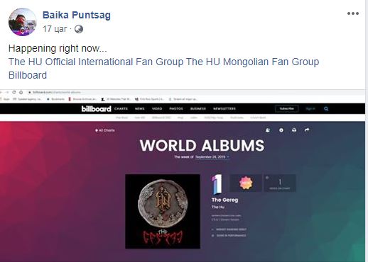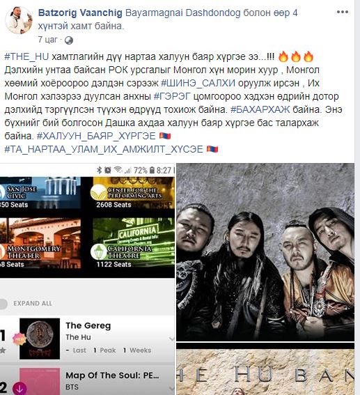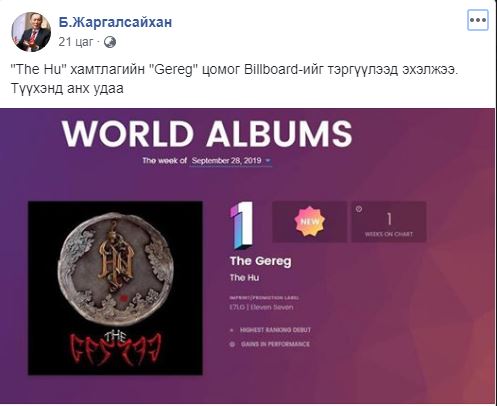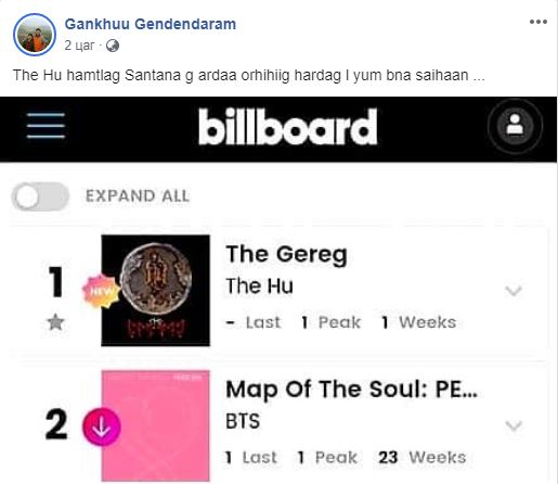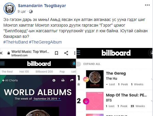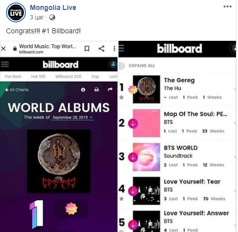 Тэр тусмаа Монголын "The Hu" хамтлаг дэлхий даяар олон сая фэнтэй "BTS" хамтлагийн "Map Of The Soul" цомгийн 23 долоо хоногийн турш тэргүүлсэн амжилтыг эвдсэн нь бүр ч бахархууштай билээ.