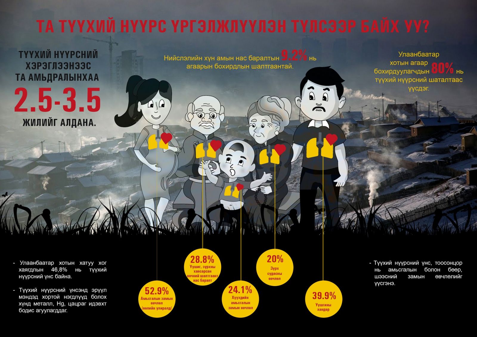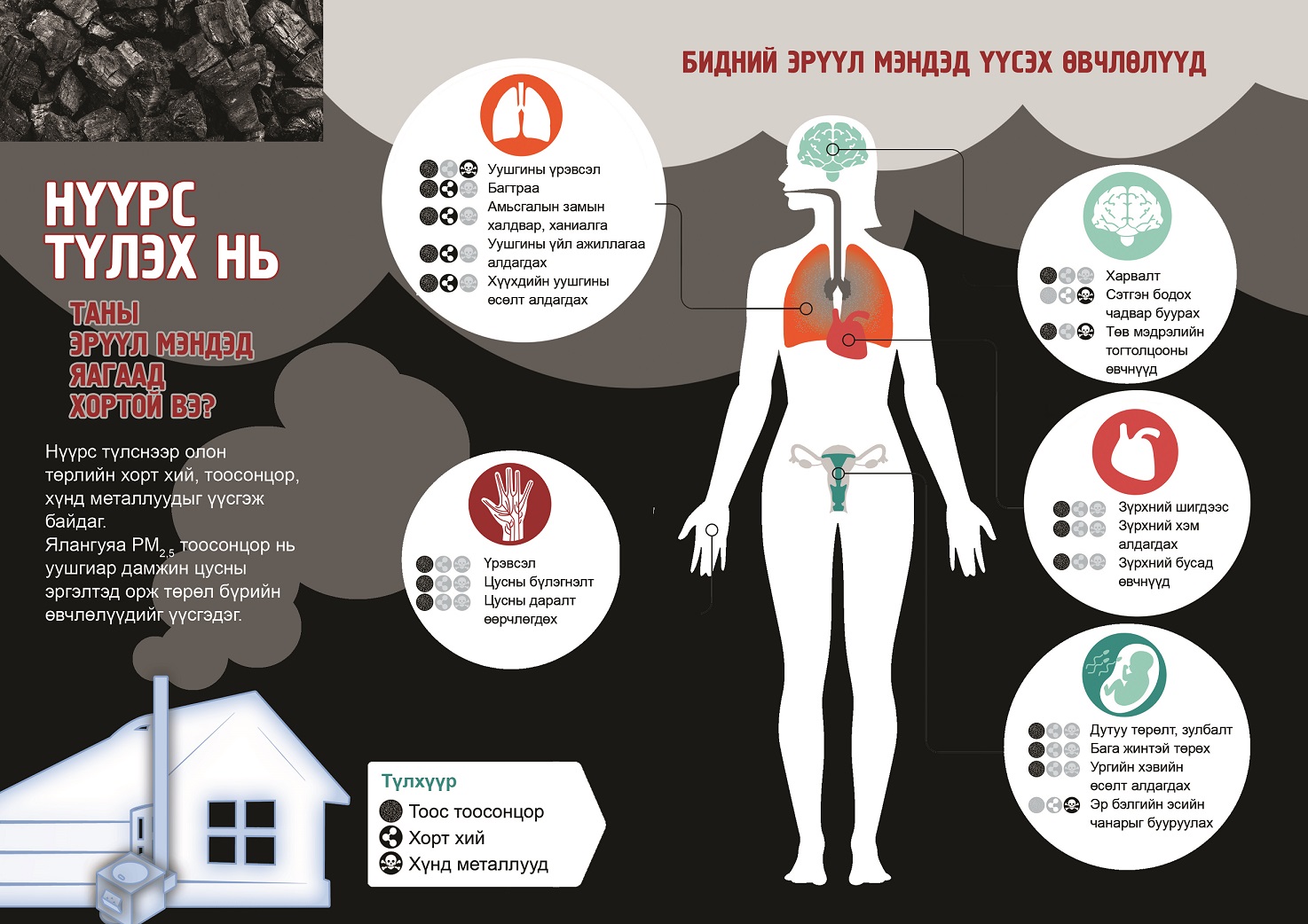 Дэлхийн жишгээр сэргээгдэх эрчим хүч, цэвэр нүүрсний дэвшилтэт технологийг нэвтрүүлэх замаар хүлэмжийн хийн ялгаруулалтыг бууруулах нь иргэн бүрийн нийгмийн ухамсар болоод оролцоо чухал байгаа талаар өнөөдрийн өдөрлөгөөр онцоллоо. Орчны эрүүл мэндийн албанаас түүхий нүүрс хэрэглэх нь хүний эрүүл мэнд, агаар, хөрс, усанд хор хөнөөлтэй талаарх суртал ухуулга бүхий гарын авлага болон агаарын бохирдлын шалтгаан болсон түүхий нүүрсний сөрөг нөлөө, хор хохирлыг харуулсан таван төрлийн видео бичлэгийг нийслэлийн зургаан дүүргийн нэгдсэн эмнэлэг болон бүх хороодын өрхийн эмнэлгээр тараажээ. Мөн эмч мэргэжилтнүүд иргэдэд зөвлөгөө мэдээллийг тогтмол хүргэж байгаа талаар Орчны эрүүл мэндийн албаны эрдэм шинжилгээний ажилтан Б.Сувд хэллээ.