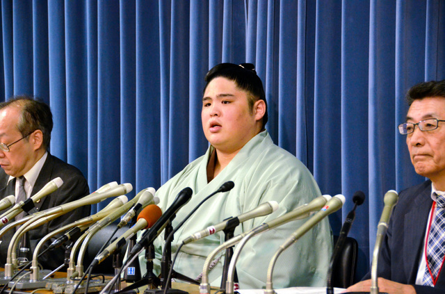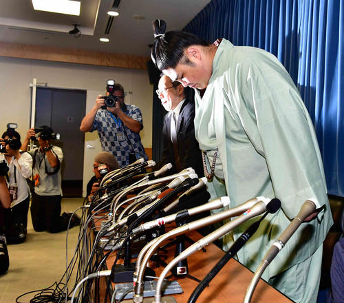Хэвлэлийн хурал дээр Таканофүжи толгой бөхийлгөн, хүлцэл өчлөө.