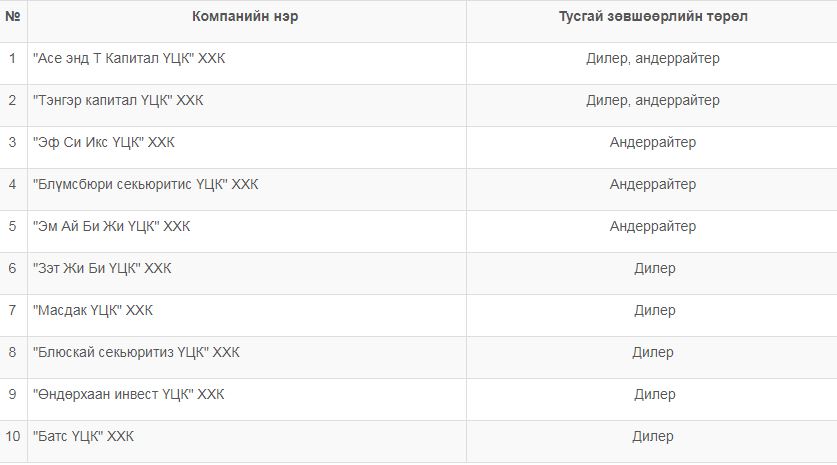 Санхүүгийн зохицуулах хорооны тогтоолоор хувь нийлүүлсэн хөрөнгөө нэмэгдүүлээгүй дараах нэр бүхий 10 компанийн дилерийн болон андеррайтерийн үйл ажиллагаа эрхлэх тусгай зөвшөөрлийг хүчингүй болгосон байна. Үүнд: