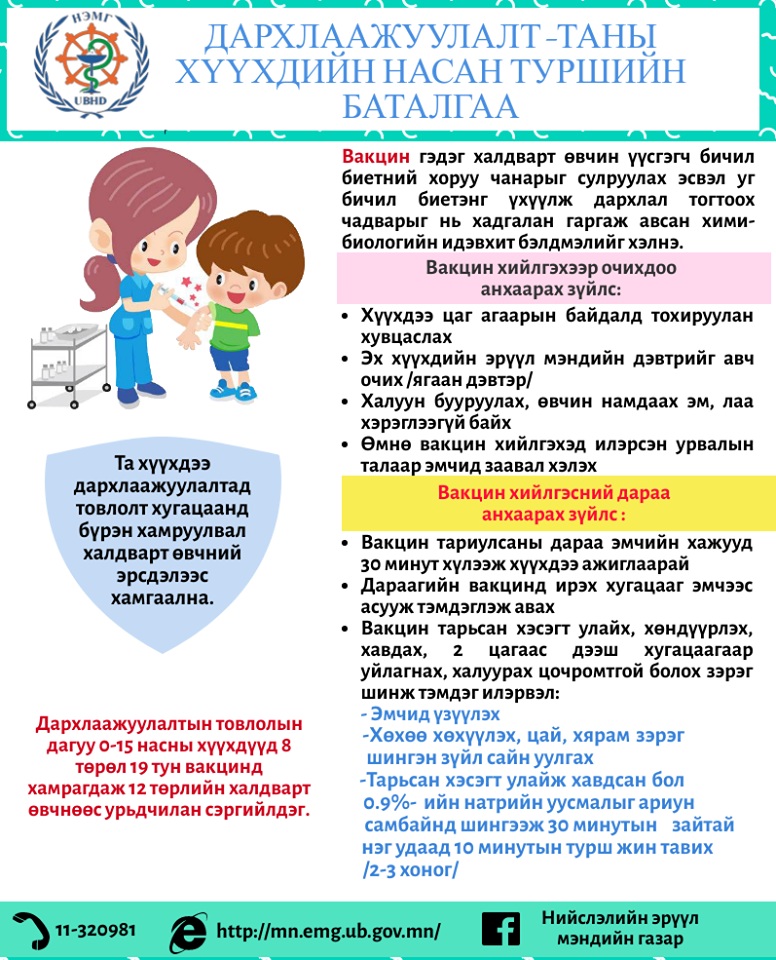 Тиймээс тус дархлаажуулалтаас хоцорсон болон сургууль завсардсан хүүхдүүдийг харьяа дүүргийн болон Өрхийн эрүүл мэндийн төвийн дархлаажуулалтын нэгжид хандан, дархлаажуулалтад нь хамруулахыг зөвлөж байна.
