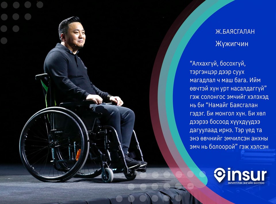 Жүжигчин Ж.Баясгалан: Алхахгүй, босохгүй, тэргэнцэр дээр суух магадлал ч маш бага. Ийм өвчтэй хүн урт насалдаггүй” гэж солонгос эмчийг хэлэхэд нь би “Намайг Баясгалан гэдэг. Би монгол хүн. Би хөл дээрээ босоод хүүхдүүдээ дагуулаад ирнэ. Тэр үед та энэ өвчнийг эмчилсэн анхны эмч нь болоорой” гэж хэлсэн...