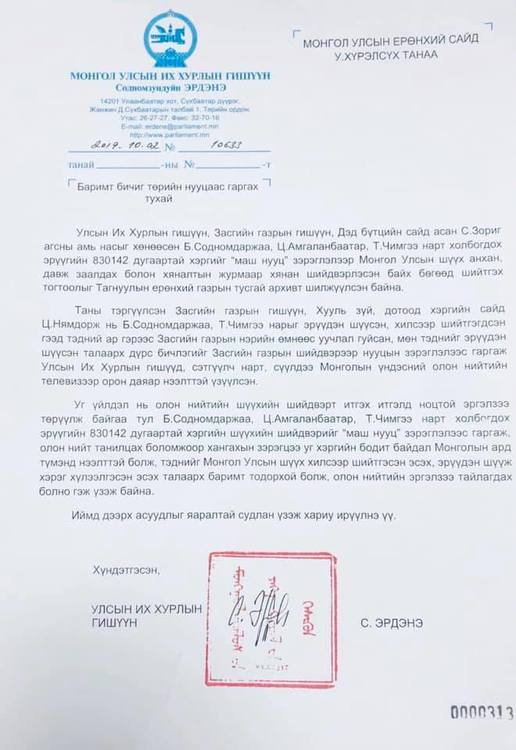 Уг үйлдэлд олон нийтийн шүүхийн шийдвэрт итгэх эргэлзээ ноцтой нөлөөлж байгаа тул Ц.Амгаланбаатар, Б.Содномдаржаа, Т.Чимгээ нарт холбогдох эрүүгийн 830142 дугаартай хэргийн шүүхийн шийдвэрийг маш нууц зэрэглэлээс гаргаж, олон нийт танилцах боломжоор хангахын зэрэгцээ уг хэргийн бодит байдал ард түмэнд нээлттэй болж, олон нийтийн эргэлзээ тайлагдах болно. Иймд уг хавтаст хэргийг маш нууц зэрэглэлээс гаргах асуудлыг судалж хариу ирүүлнэ үү" гэжээ.