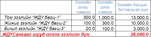 Жижиг, дунд үйлдвэрийг хөгжүүлэх сангаас урт хугацаатай, хөнгөлөлттэй зээл олгох, төсөл сонгон шалгаруулах журмын хүрээнд 100.0-300.0 сая төгрөгийн зээл хүссэн нийт 349 иргэн, аж ахуйн нэгж хүсэлт ирүүлсэн юм. Нийтдээ 86,8 тэрбум төгрөгийн зээлийн хүсэлт иж бүрдэл болон төслийн шаардлага ханган ЖДҮХСанд судлагдсанаас 270 иргэн, аж ахуйн нэгжийн 68,3 тэрбум төгрөгийн зээлийн хүсэлт бүхий төсөл урьдчилсан судалгааны шатанд 70-аас дээш оноо авч тэнцлээ.