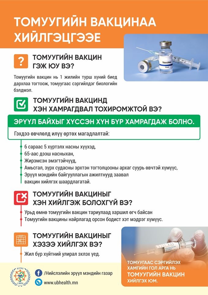 Мөн улирлын томуугийн эсрэг вакцин хийлгэх хүсэлтэй иргэдийн хувьд Халдварт өвчин судлалын үндэсний төв /ХӨСҮТ/-ийн Сайн дурын дархлаажуулалтын кабинетад өдөр бүр 8:30-14:30 цагийн хооронд очиж хийлгэх боломжтой бөгөөд нэг хүн тун нь 15 мянган төгрөгийн үнэтэй юм.