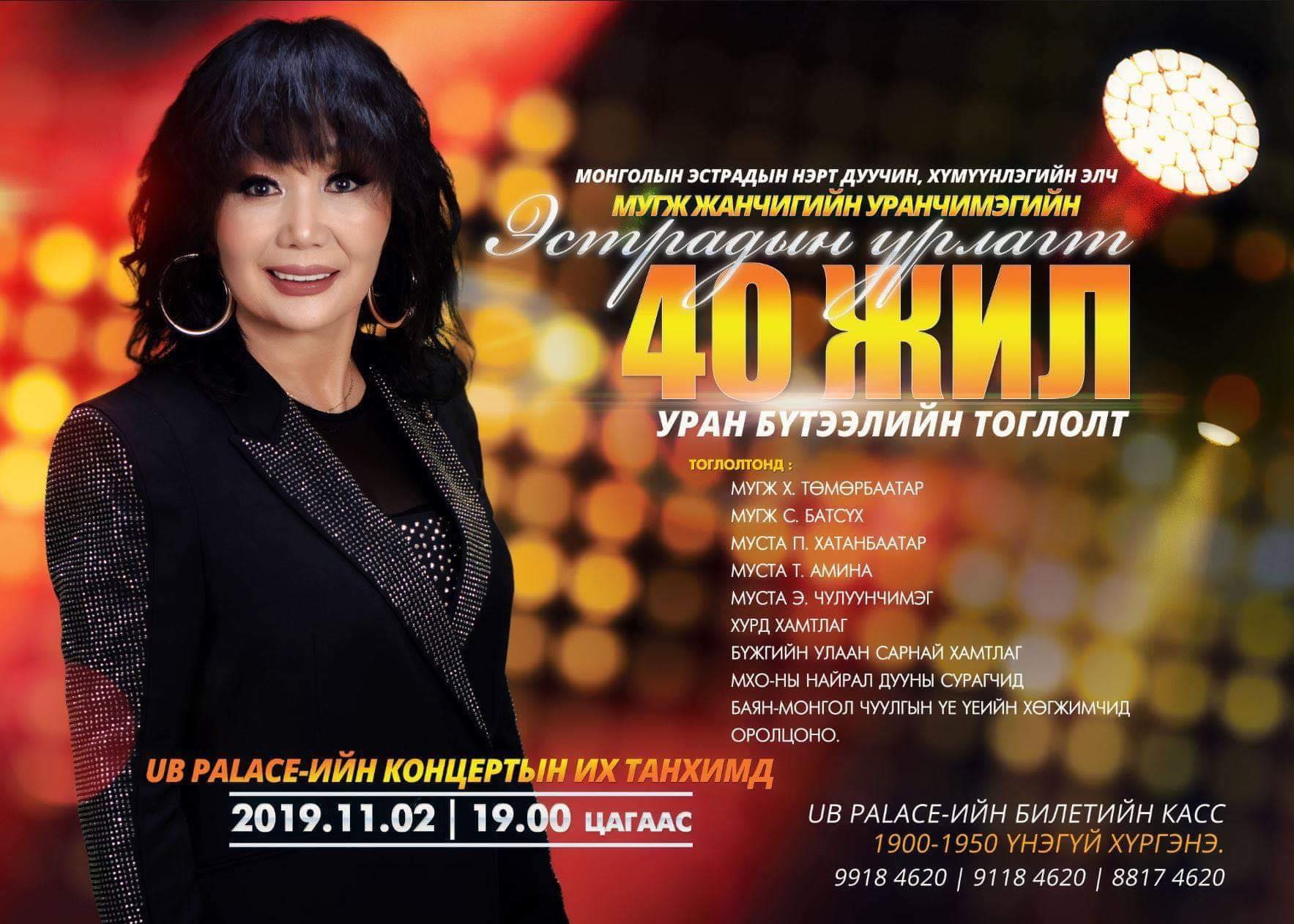 Монголын эстрадын урлагт 40 жил зүтгэсэн Гавьяат жүжигчин, хүмүүнлэгийн элч дуучин Ж.Уранчимэг арваннэгдүгээр сарын 02-нд "Улаанбаатар палас"-ын их танхимд ганцхан удаа тоглолтоо хийх гэж байна.