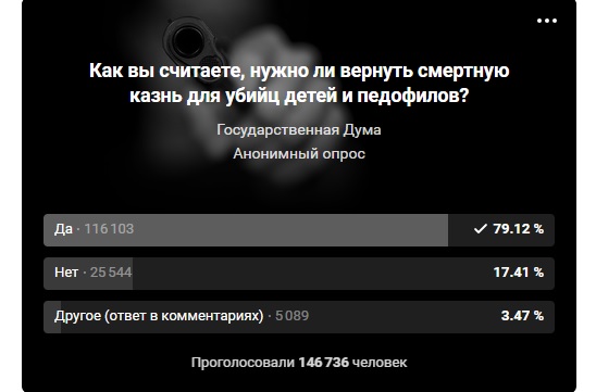 Энэ үйл явдалтай холбогдуулан ОХУ-ын Төрийн Думаас олон нийтийн сүлжээгээр “Бага насны хүүхдийг хүчирхийлэх, амь насыг нь хохироосон хэрэгт цаазын ялыг сэргээн хэрэглэх ёстой юу” гэсэн санал асуулга явуулж эхлээд байна.