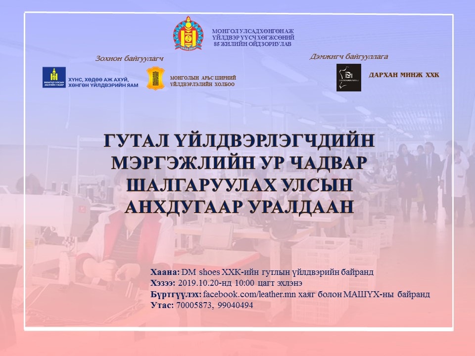 Арьс ширний үйлдвэрлэлийн салбарт ажиллагсдын чадварлаг боловсон хүчнийг нээн илрүүлэх, мэргэжлийн ур чадвар, тэргүүн туршлагыг түгээн дэлгэрүүлэх, солилцох, салбарын боловсон хүчний үнэлэмжийг дээшлүүлэх, олон улсын тэмцээнд оролцуулах зорилгоор ажил мэргэжлийн ур чадварын аварга шалгарах уралдааныг 10 дугаар сарын 20 өдөр ДМ шүүс ХХК-ийн гутлын үйлдвэрийн байранд зохион байгуулна. Арьс ширэн бүтээгдэхүүн үйлдвэрлэлийн салбарын гутал үйлдвэрлэгчдийн мэргэжлийн ур чадвар шалгаруулах улсын анхдугаар уралдааныг гутлын дизайн, зохион бүтээлт, эсгүүр, оёдол, татлага, уллагааны ур чадваруудыг үнэлж дүгнэх юм. Энэ удаагийн уралдаан Монгол улсад Хөнгөн аж үйлдвэрийн салбар үүсэж хөгжсөний 85 жилийн ойг тохиолдуулан зохион байгуулж буйгаараа онцлог болж байна.