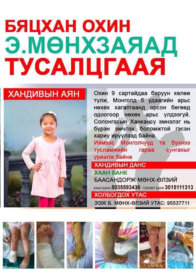 Охины ээж түүний биеийн байдлаар талаар "Миний охин есөн сартайдаа түлэгдэж, өдийг хүртэл Гэмтэл, согог судлалын үндэсний төвд таван удаа хагалгаанд орсон. Одоогоос жил гаруйн өмнө сүүлийн гурван хагалгаа дараалан хийгдэж, эхний хагалгаа нь амжилтгүй болж, дараа нь хоёр хагалгаа дараалан хийлгэж, хиймэл арьс тавьсан боловч биенд нь барьцалдаж өгөөгүйн улмаас Монголд дахин хагалгаанд орох ямар ч боломжгүй болсон юм. Хамгийн гол нь хүүхдийн маань арьс мянгад нэг тохиолддог ургаж төлждөг бие махбодийн онцлогтой учраас Монголд эмчлэх боломжгүй гэсэн хариу сонслоо. Өмнөд Солонгосын "Хангансоо" эмнэлгийн эмч нар 2019.05.26-нд манай гэрт ирж, охины минь биеийн байдалтай танилцаад явсан. Ингээд 2019.08.28-нд "Хангансоо" эмнэлгийн эмч нараас "Охиныг эмчлэх боломжтой" гэсэн хариу ирүүлсэн. Хүүхдийн маань хөлийг хурдан эмчлэхгүй бол мэдрэлд нь нөлөөлж, хөлөө тайруулахад хүрээд байна. Монголд эмчлүүлж боолгож явсаар өнөөдөр 5 нас хүрч, эрүүл нөхөх арьсгүй болсон тул сүүлчийн найдвар нь БНСУ явж, бүрэн эдгэрэх итгэл болж үлдээд байна. Шат дараалсан үйлдэлтэй хагалгааны нийт зардалд 200 сая төгрөг шаардлагатай болсон тул түмэн олноосоо тусламж хүсэж бна. Буян буцаж ирэхдээ бороо мэт асгардаг" гэжээ.