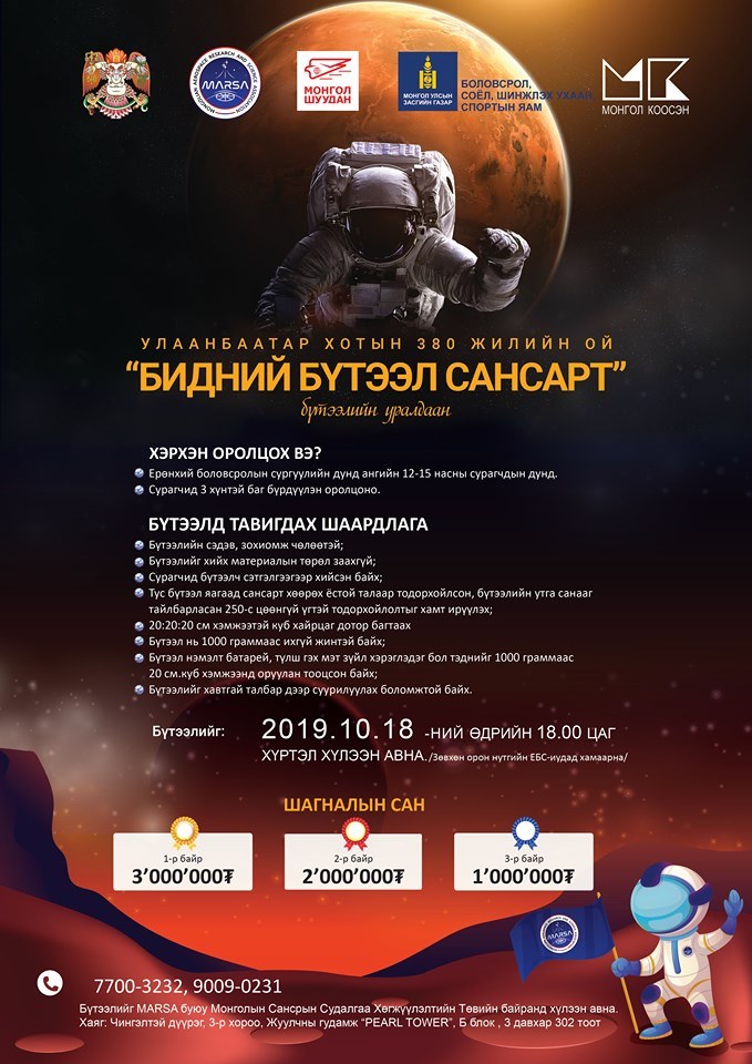 Улаанбаатар хотын 380 жилийн ойг тохиолдуулан Хүүхэд залуус, өсвөр үеийг шинжлэх ухаанч хандлагатай болгох, бүтээлч шинэ үеийг дэмжихэд урам зориг төрүүлэх зорилгоор 2019.10.29-ний 10:00 цагт MARSA буюу Монголын сансрын судалгаа хөгжүүлэлтийн төв ТББ, НЗДТГ-тай хамтран Нийслэлийн төв талбайгаас Сансрын бөмбөлөг хөөргөхөөр болсон.