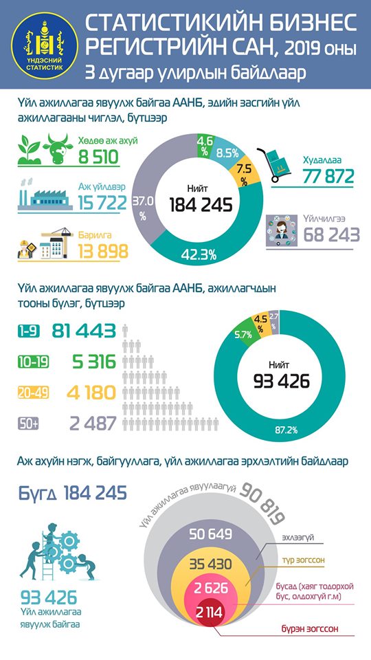 Статистикийн бизнес регистрийн санд энэ оны гуравдугаар улирлын байдлаар 184.2 мянган аж ахуйн нэгж, байгууллага бүртгэлтэй байгаагийн 93.4 мянга буюу тэн хагас нь үйл ажиллагаа явуулж байна. Бүртгэлтэй, үйл ажиллагаа явуулж байгаа аж ахуйн нэгж, байгууллагын 63 мянга нь Улаанбаатар хотод, 10 мянга нь Төвийн бүс, 9.3 мянга нь Хангайн бүс, 7.6 мянга нь Баруун бүс, 3.6 мянга нь Зүүн бүсэд ногдож байна.