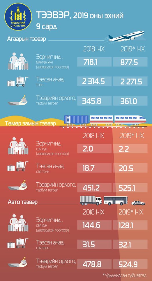Бүх төрлийн тээврээр тээсэн ачаа оны эхний есөн сард 52.6 сая тонн, зорчигчид давхардсан тоогоор 131.1 сая хүн болжээ. Энэ нь өмнөх оны мөн үеэс тээсэн ачаа 2.4 сая тонноор өсөж, зорчигчид 16.1 сая хүнээр буурсан үзүүлэлт юм.