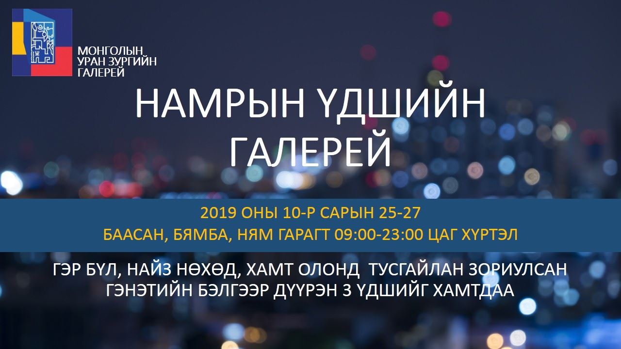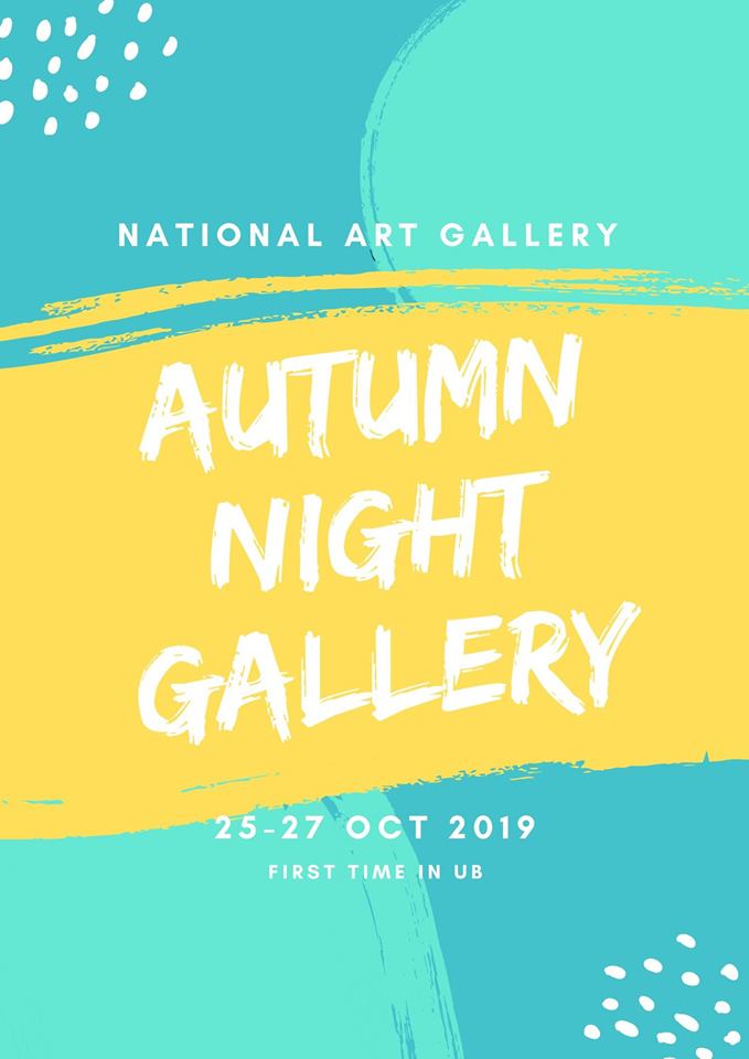 Уран зураг, дүрслэх урлаг сонирхогчдод зориулан анх удаа "Намрын үдшийн галерей" хөтөлбөрийг Монголын уран зургийн галерейгаас санаачлан аравдугаар сарын 25-наас 27-ны өдөр хүртэл буюу энэ амралтын өдрүүдэд зохион байгуулахаар болоод байна.