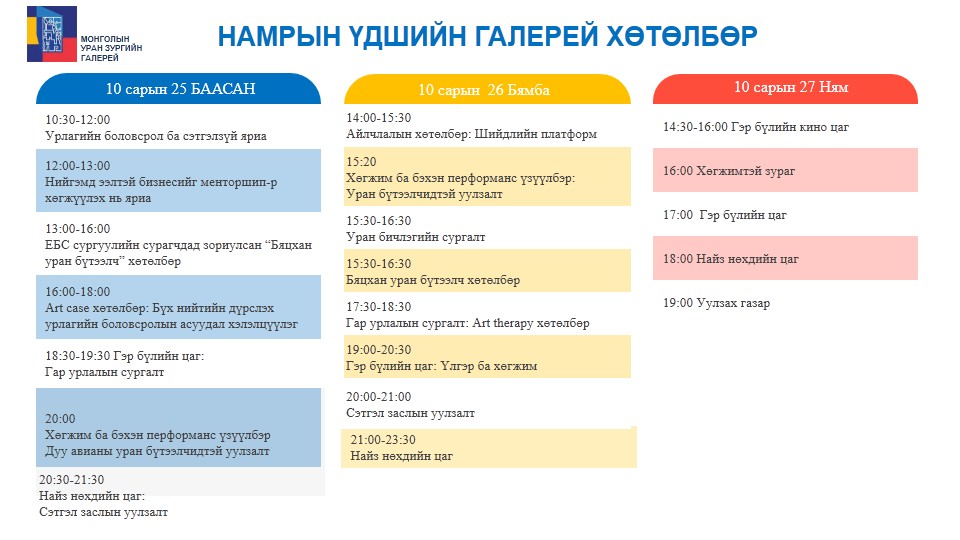 Энэ үеэр Монголын уран зургийн галерей уртасгасан цагаар буюу шөнийн 00:00 цаг хүртэл ажиллах юм. Гэр бүл, найз нөхөд, хамт олонд зориулсан урлагийн үйл ажиллагаануудаас гадна дүрслэх урлагийн шилмэл бүтээлийн "Оны шилдэг бүтээл-2019" үзэсгэлэнг үзэх боломжтой .