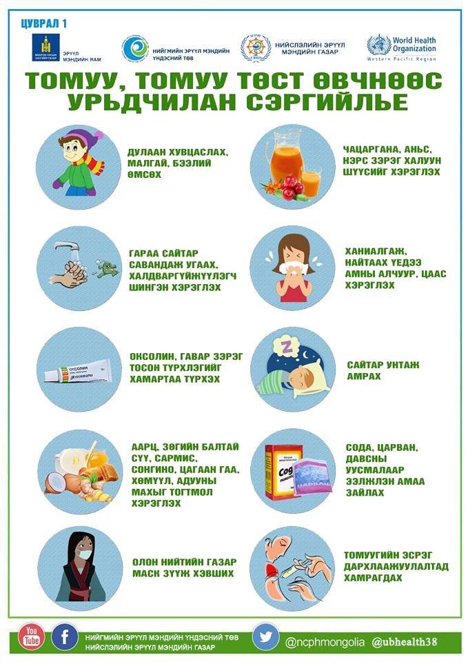 - Хүүхдийг улирлын байдалд тохируулан хувцаслах, олон нийтийн газар авч явахгүй байх, өвчилсөн бол гэрт нь байлгаж, бусдад халдвар тараахгүй байхыг зөвлөж байна.