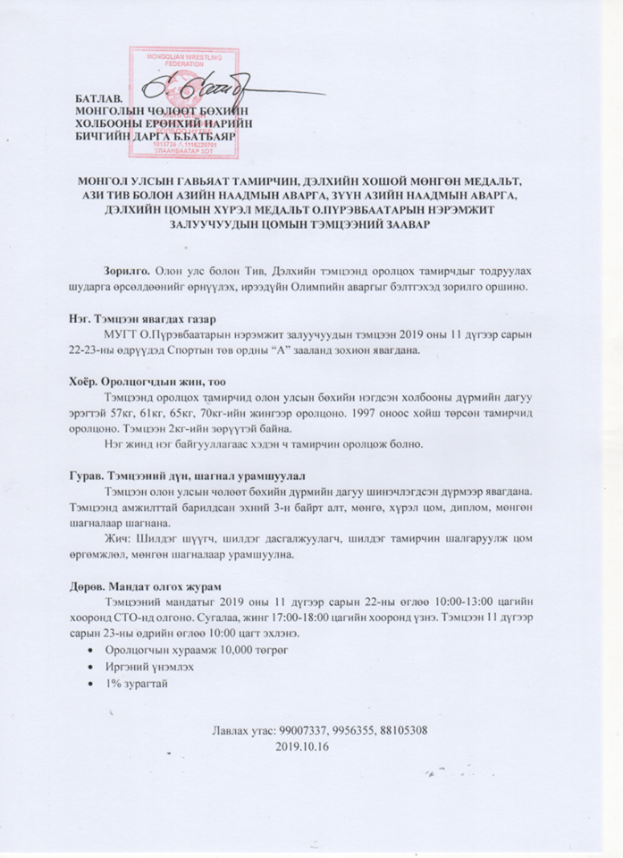 11 дэх удаагийн тэмцээнд оролцох тамирчид, дасгалжуулагчид тэмцээний заавартай танилцана уу.