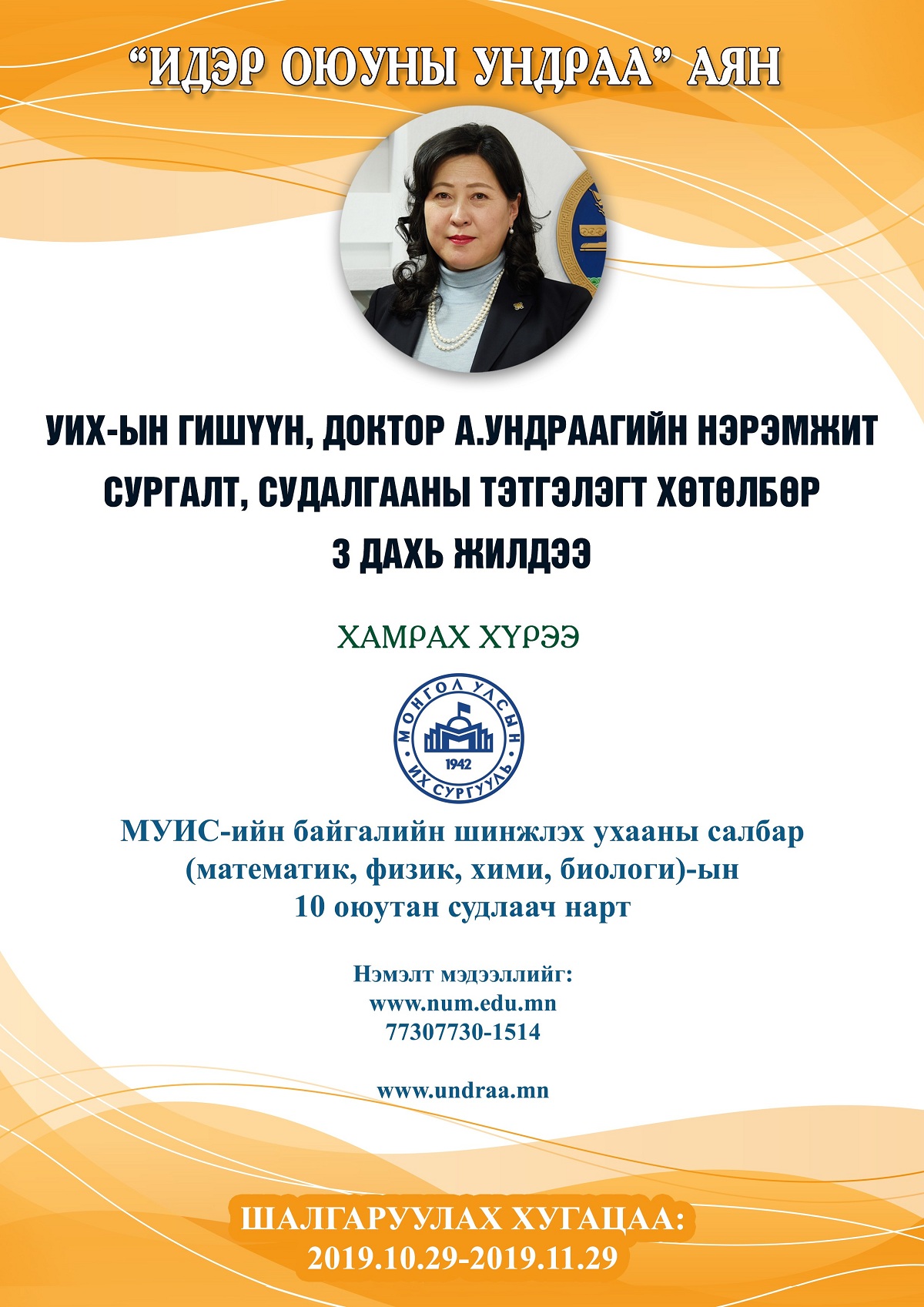 УИХ-ын гишүүн, физикийн ухааны доктор /Ph.D/ Агваанлувсангийн Ундраагийн санаачилгаар 2017 оноос эхлүүлсэн “Идэр оюуны ундраа” аяныг 3 дахь жилдээ зохион байгуулах гэж байна. Шинжлэх ухаан, боловсролыг дэмжих зорилго бүхий энэхүү аяны хүрээнд 3 жилийн хугацаанд МУИС-ийн байгалийн шинжлэх ухааны салбарын 20, ХААИС-ын мал аж ахуй, биотехнологийн сургуулийн 5, нийт 25 оюутанд нэрэмжит сургалт, судалгааны тэтгэлэг олгожээ.