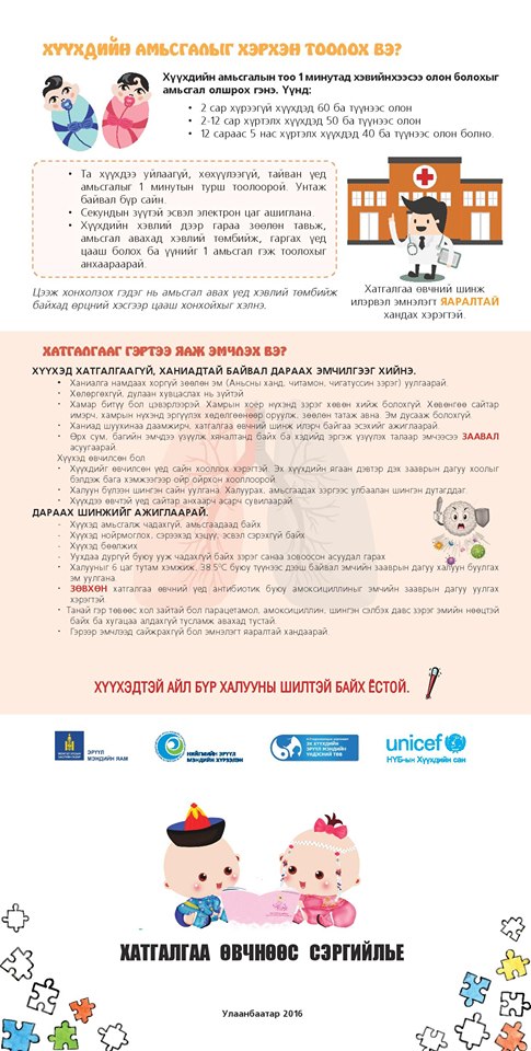 Нийслэлийн Эрүүл мэндийн газраас энэ удаад хатгалгаа өвчний тухай ерөнхий ойлголт, урьдчилан сэргийлэх дадал хэвшил, уг өвчнөөр өвчилсөн эсэхийг гэрийн нөхцөлд таних арга, хүүхдийн амьсгалын тоог хэрхэн зөв тоолох зэргийг тус зөвлөмжөөр дамжуулан хүргэлээ.