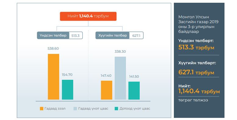 Монгол Улсын Засгийн газар энэ оны гуравдугаар улирлын байдлаар 1 их наяд 140.4 тэрбум төгрөгийн өр төлжээ. Үндсэн төлбөрт 513.3 тэрбум төгрөг, хүүгийн төлбөрт 627.1 тэрбум төгрөг төлсөн байна. Засгийн газрын өрийн эдийн засагт үзүүлэх дарамт буурч байгаа гэж Сангийн яамнаас мэдэгдэв.