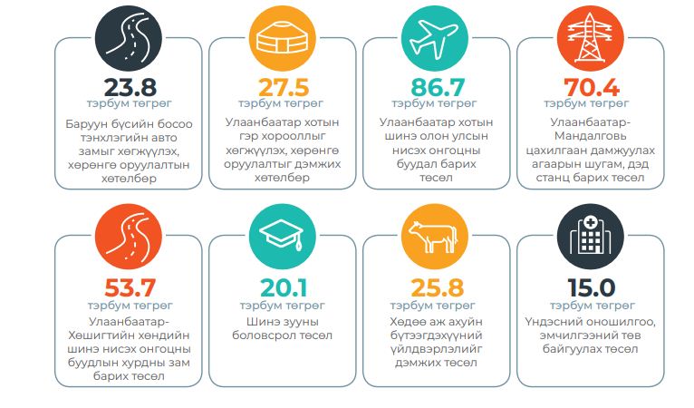 - Улаанбаатар хотын гэр хорооллыг хөгжүүлэх, хөрөнгө оруулалтыг дэмжих хөтөлбөрийг 27.5 тэрбум төгрөгөөр
