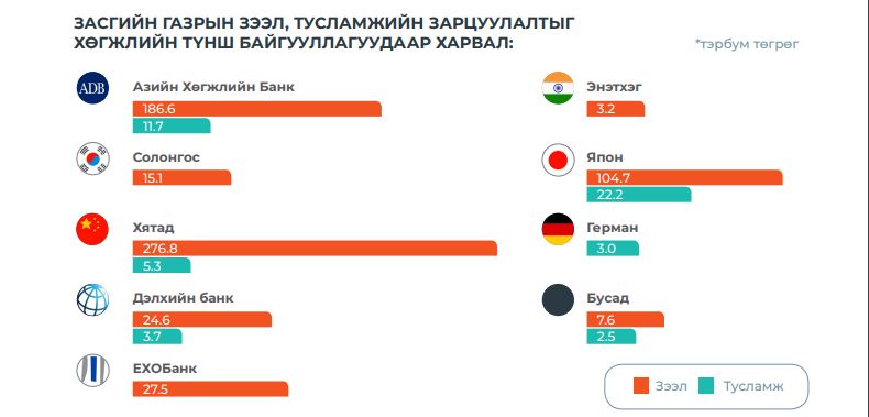 Тэгэхээр оны эхний есөн сарын гүйцэтгэлээс харахад 300 гаруй тэрбум төгрөгийн санхүүжилт хийгдсэн байна. Засгийн газрын зээл, тусламжийн зарцуулалтыг хөгжлийн түнш байгууллагуудаар харвал: Хамгийн өндөр дүнтэй зээлийг БНХАУ-аас авч буй бол Япон улс 22.2 тэрбум төгрөгийн тусламж өгч буйгаараа эхэнд бичигдэж байна.