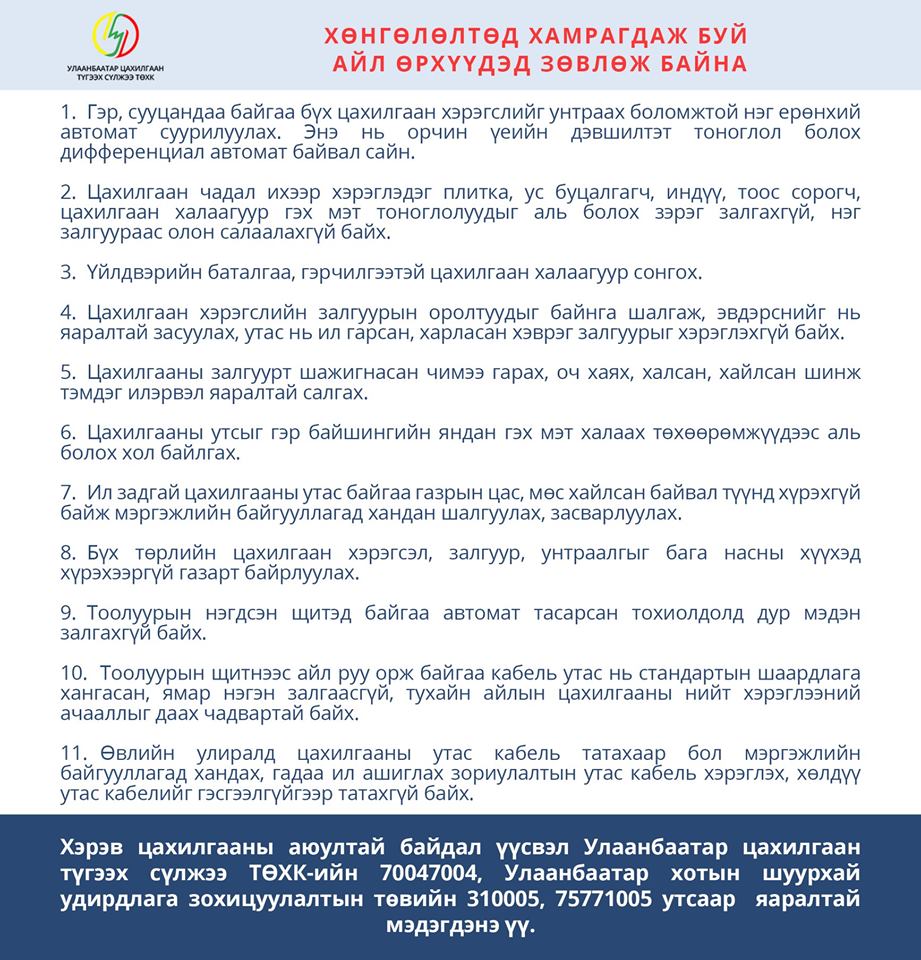 Цахилгааны шөнийн тарифын хөнгөлөлт олгох ажил хэрэгжиж эхэлсэнтэй холбогдуулан айл өрхүүдэд цахилгааны аюулгүй байдлаа сайтар хангахыг Улаанбаатар цахилгаан түгээх сүлжээ ТӨХК-аас зөвлөж байна.