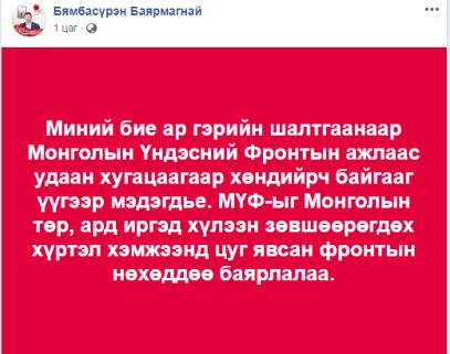 Тэрбээр "Миний бие ар гэрийн шалтгаанаар "Монголын Үндэсний фронт"-ын ажлаас удаан хугацаагаар хөндийрч байгааг үүгээр мэдэгдье. МҮФ-ыг Монголын төр, ард иргэд хүлээн зөвшөөрөгдөх хүртэл хэмжээнд цуг явсан фронтын нөхөддөө баярлалаа" хэмээжээ.