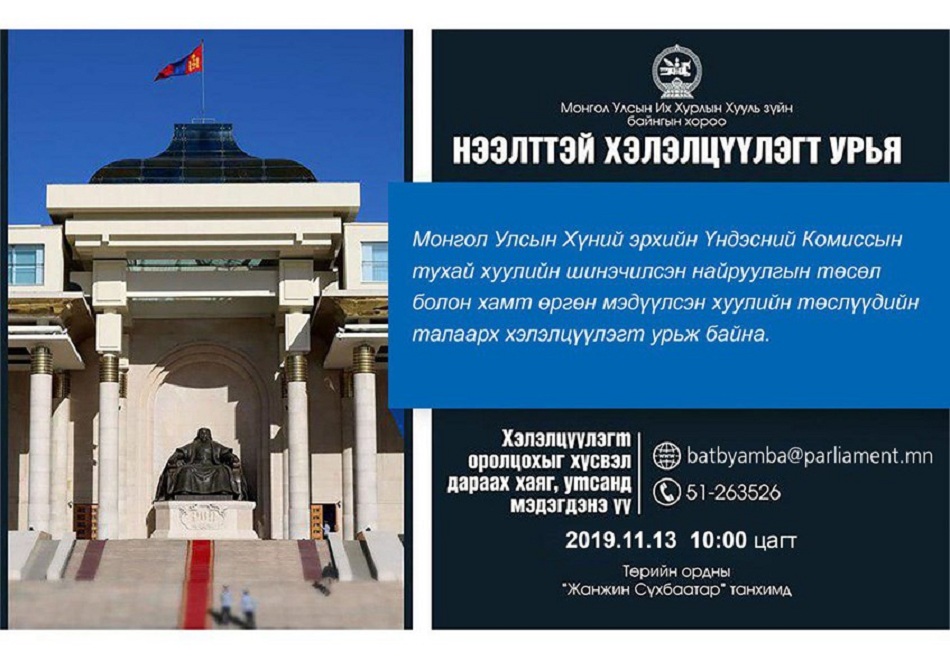 Монгол Улсын Хүний эрхийн Үндэсний Комиссын тухай хуулийн шинэчилсэн найруулгын төсөл болон хамт өргөн мэдүүлсэн хуулийн төслүүдийн талаарх Хууль зүйн байнгын хорооны хэлэлцүүлэг 2019 оны 11 дүгээр сарын 13-ны өдрийн 10.00 цагаас Төрийн ордны “Жанжин Д.Сүхбаатар” танхимд болно.