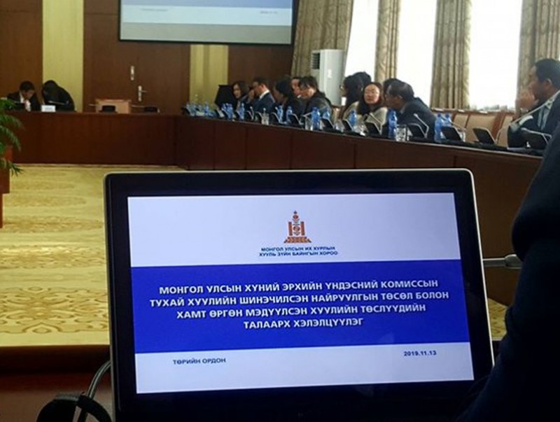 Монгол Улсын Хүний эрхийн үндэсний комиссын тухай хуулийн шинэчилсэн найруулгын төслийг Засгийн газраас 2019 оны аравдугаар сарын 8-ны өдөр УИХ-д өргөн мэдүүлсэн. Уг хуулийн төслийн талаарх хэлэлцүүлгийг УИХ-ын Хууль зүйн байнгын хорооноос Төрийн ордонд зохион байгуулсан юм. Уг хэлэлцүүлэгт УИХ-ын гишүүн, Хүний эрхийн дэд хорооны дарга Н.Оюундарь, УИХ-ын гишүүн Н.Учрал, Хууль зүйн, дотоод хэргийн яам, Гадаад харилцааны яам, Цагдаагийн ерөнхий газар, Хүний эрхийн үндэсний комисс болон төрийн бус байгууллага, иргэний нийгмийн байгууллага, иргэдийн төлөөлөл оролцож, санал бодлоо хуваалцлаа.