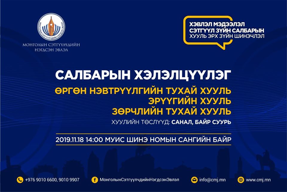 Монголын сэтгүүлчдийн нэгдсэн эвлэл /МСНЭ/-ээс санаачлан “Хэвлэл мэдээлэл, сэтгүүл зүйн салбарын хууль эрх зүйн шинэчлэл” сэдвээр энэ сарын 18-нд хэлэлцүүлэг зохион байгуулах гэж байна. Дээрх сэдвийн хүрээнд Өргөн нэвтрүүлгийн тухай хууль, Эрүүгийн хууль, Зөрчлийн хуульд орж буй сэтгүүл зүйн салбартай холбоотой нэмэлт өөрчлөлтийн талаар санал, солилцох юм.