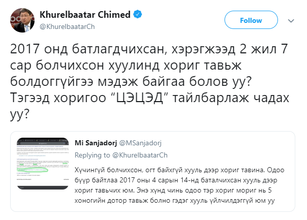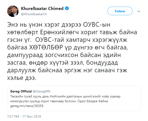 Тэгвэл Сангийн сайд Ч.Хүрэлбаатар өөрийн цахим хаягаараа дамжуулж, эл асуудалд байр сууриа илэрхийлжээ.