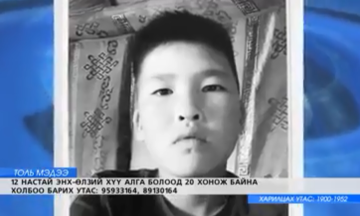 Хүүгээ алга болсныг Цагдаагийн газарт бүртгүүлж, эрэн сурвалжлуулж, хүүгийн зурагт хуудсыг хотын гудамжаар наасан боловч сураг гаралгүй 20 хоног өнгөрөөд байна. Энэ тухай ТВ-8 телевиз сурвалжилжээ.