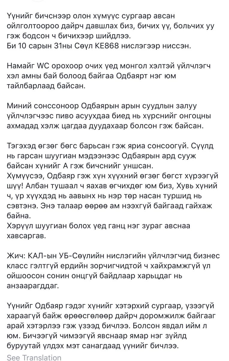 Харин тэр үйлчлүүлэгчийнхээ эсрэг ажилласан Кореан айр ыг олон улсын шүүхэд өгөх хэрэгтэй. Манайхаас өөр улс орон иргэнээ ингэж гүтгүүлсэн бол солонгос шиг эсрэг мэдэгдлээр дэлхийд цацах байсан. Кореан айр компани санаатайгаар үйлчлүүлэгч рүүгээ дайрсан. Хэл устай бол наад жиргээгээ дэлхийд тавиач дүү! Монголчууд бол үнэнд дургүй болцон шүү дээ. Тамын тогоогоороо л нэггийгээ булшилж байвал худлаа гүтгэсэн байсан ч хамаагүй. Одбаяртаа биш Монгол хүндээ учир нь байгаа гэж ойлгох хүн Жагаа ахаас өөр алга.