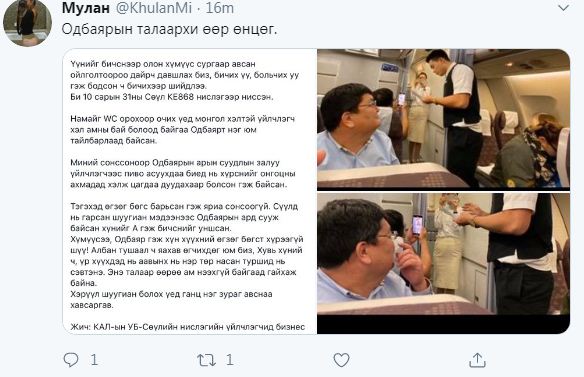 Үндсэн хуулийн Цэцийн дарга Д.Одбаяртай холбоотой асуудал сүүлийн өдрүүдэд хамгийн халуун сэдэв болоод буй. Тэгвэл Сөүлийн онгоцон дотор сууж явсан үеийн зургийг нь тухайн үед онгоцонд зорчиж явсан зорчигч өөрийн твиттер хуудастаа дараах байдлаар нийтэлснийг нэмэр хачиргүй хүргэе.