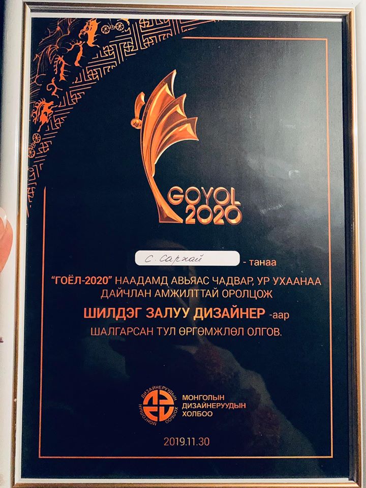 Өөрийн мөрөөдлийг тайзнаа амилуулж, загвар өмсөгч болон загвар зохион бүтээгчийн хувиар Монголын хамгийн том загварын наадамд болох "Гоёл 2020"-д оролцсон тэрбээр "Сэтгэгдэл маш өндөр байна. Анх удаагаа өөрийнхөө бүтээсэн загвараар тэмцээнд оролцож байна. Миний мөрөөдөл өөрийнхөө загварын тайзнаа амилуулах байсан. Тэр мөрөөдөл маань биеллээ. Дээрээс нь "Шилдэг залуу дизайнер" шагнал авсандаа маш их баяртай байна. Тайзан дээр зогсож байгаа загвар зохион бүтээгч гэж дуудуулахдаа хэсэг "Юу билээ" гэж бодсон. Гэхдээ маш гоё байлаа" хэмээн сэтгэгдлээсээ хуваалцлаа.