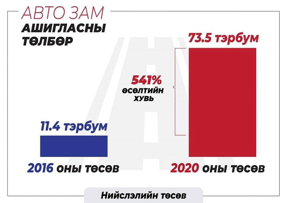 Нийслэлийн төсвийн орлогыг бүрдүүлэх нэг үүсвэр нь Зам ашигласны төлбөр. Тэгвэл 2020 онд Зам ашигласны төлбөрийг тав дахин нэмэгдүүлэхээр болж байна. Ингэснээр 73.5 тэрбум төгрөг нийслэлийн төсөвт төвлөрөх аж. 2016 оныхтой харьцуулахад 541 хувиар өссөн үзүүлэлт юм.