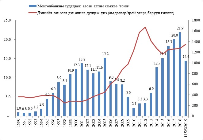 1990-2019 онд Монголбанкны худалдан авсан алтны хэмжээ (тонн)