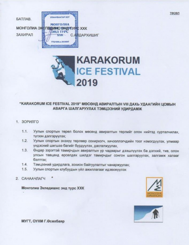 Байгаль орчин аялал жуулчлалын яам,“Монголия Экспедишнс энд турс” ХХК, Монголын уулчдын үндэсний холбоо, Өвөрхангай аймгийн аялал жуулчлалын холбоо хамтран “KARAKORUM ICE FESTIVAL 2019” мөсөнд авиралтын 8 дахь удаагийн цомын аврага шалгаруулах тэмцээнийг 2019 оны 12 сарын 7,8-ны өдрүүдэд Өвөрхангай аймгийн Бат-өлзий сумын Орхоны хүрхрээнд зохион байгуулна.