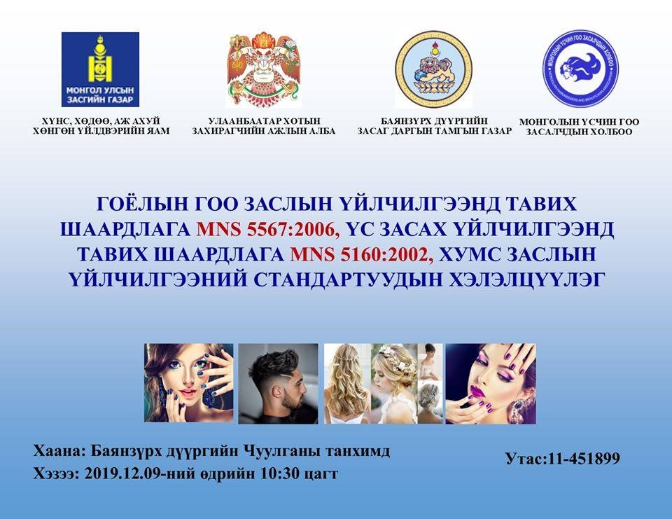 Нийслэлийн Баянзүрх дүүргийн Засаг даргын Тамгын газраас Үс засах үйлчилгээнд тавих шаардлага MNS 5160:2002, Гоёлын гоо заслын үйлчилгээнд тавих ерөнхий шаардлага MNS 5567:2006 стандартуудыг шинэчлэх, Хумс заслын үйлчилгээний стандартыг шинэчлэн боловсруулах зорилготой хэлэлцүүлгийг зохион байгуулах гэж байна. Тус хэлэлцүүлэг 2019 оны 12 дугаар сарын 09-ний өдөр Засаг даргын Тамгын газрын Чуулганы танхимд болох тул дүүргийн нутаг дэвсгэрт ахуйн үйлчилгээний чиглэлээр үйл ажиллагаа явуулдаг иргэн, аж ахуйн нэгж байгууллагууд идэвхтэй оролцоно уу хэмээн Баянзүрх дүүргийн ЗДТГ-ын Хэвлэл мэдээллийн албанаас мэдээллээ.