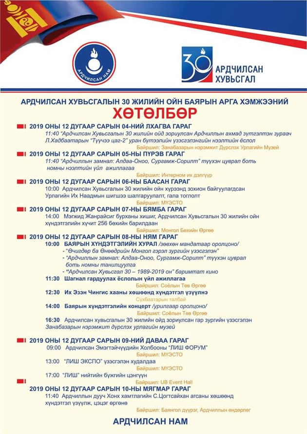 Ардчилсан хувьсгалын 30 жилийн ойн хүрээнд өнөөдөр хүндэтгэлийн хурал болохоос гадна шагнал гардуулах ёслол, Их эзэн Чингис хааны хөшөөнд цэцэг өргөн ёслол, баярын хүндэтгэлийн концерт, 30 жилийн ойд зориулсан гар зургийн болон гэрэл зургийн үзэсгэлэн, номын нээлт болох юм.