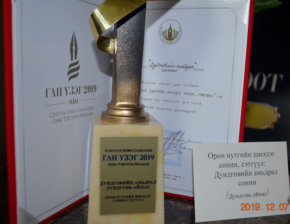 Монголын сэтгүүлчдийн 2019 оны шилдгээ тодруулах "Ган үзэг" шагнал гардуулах ёслолоор энэ оны орон нутгийн шилдэг сониноор "Дундговийн амьдрал" сонин шалгарлаа.