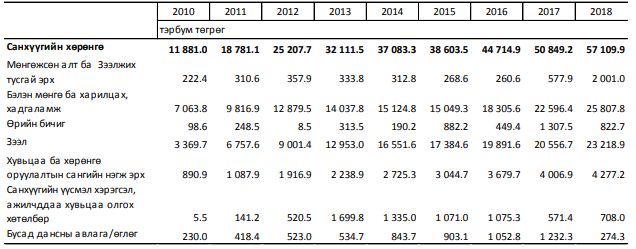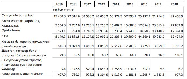 Монгол Улсын нийт санхүүгийн хөрөнгө 2018 оны эцэст 57.1 их наяд төгрөгт хүрч, 2010 оноос 4.8 дахин, 2017 оноос 12.3 хувиар өсжээ. Нийт санхүүгийн хөрөнгөнд: